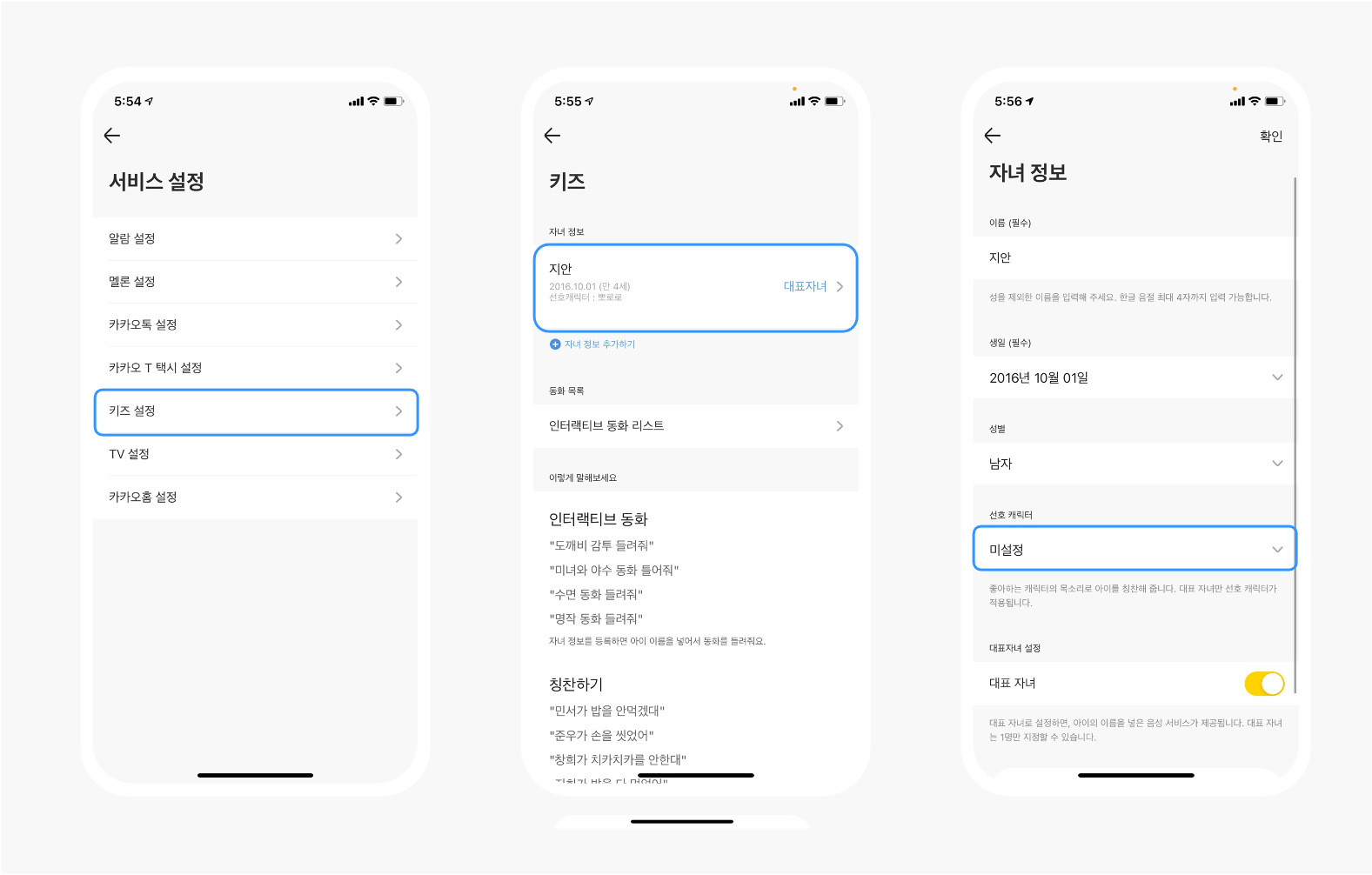 키즈 설정에서 자녀 정보 및 선호 캐릭터 설정을 해주세요.